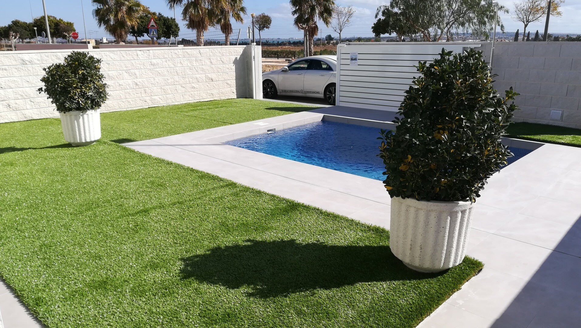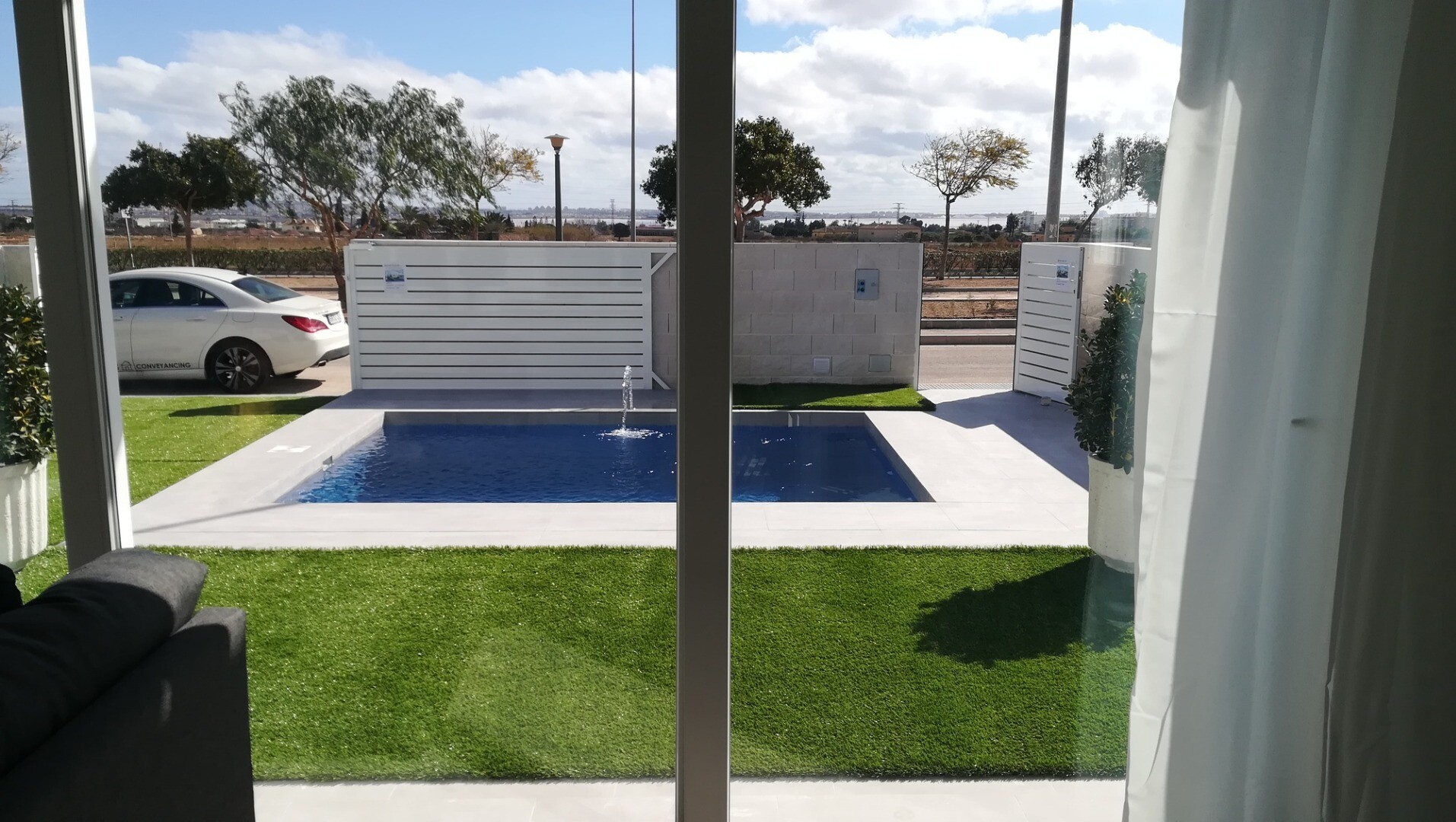 Красивые виллы на первом этаже с готовым бассейном, садом, солярием, электрическими жалюзи и автоматическим открыванием ворот с панорамным видом на горизонт и розовые соленые озера Торревьехи.