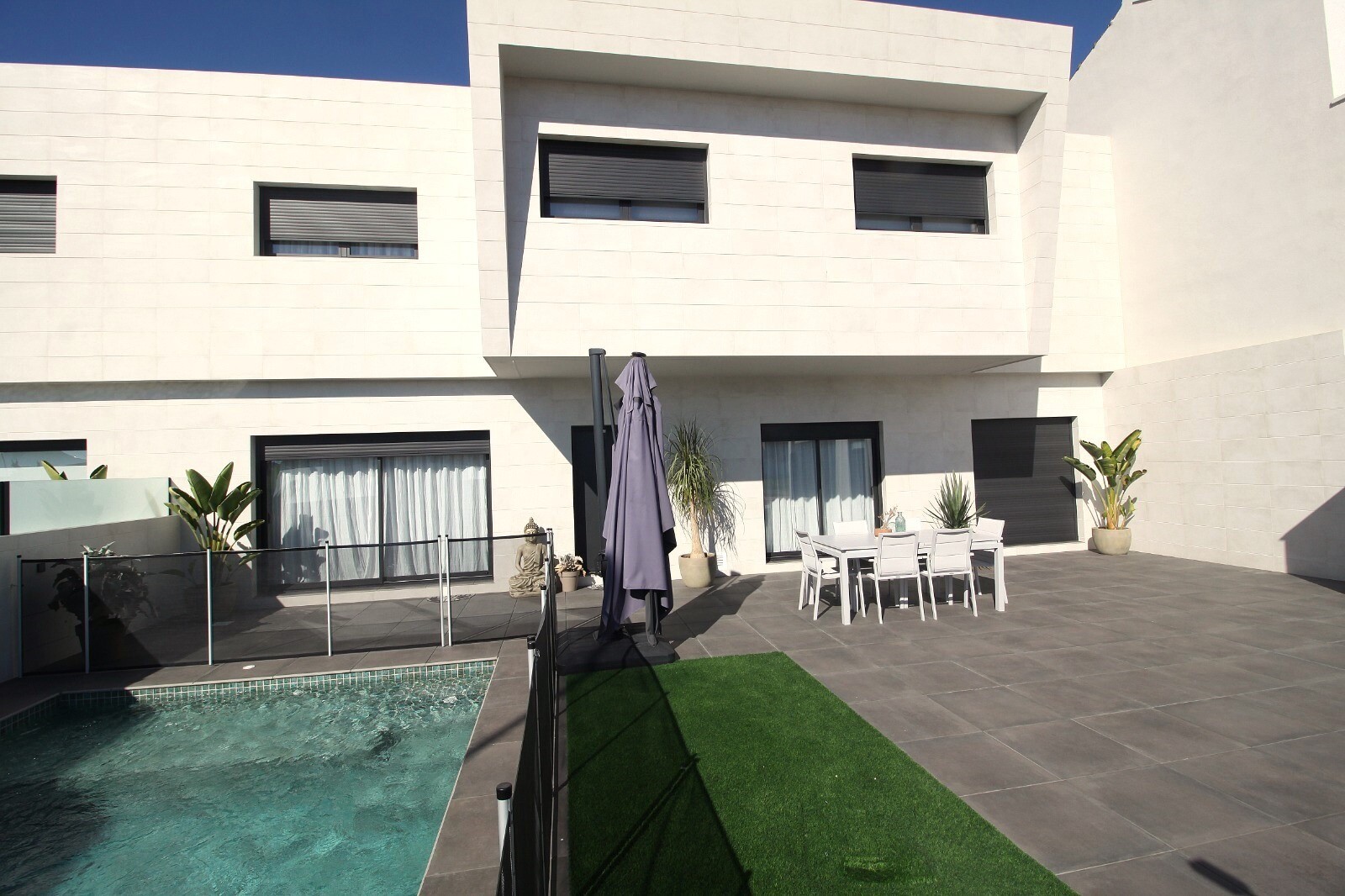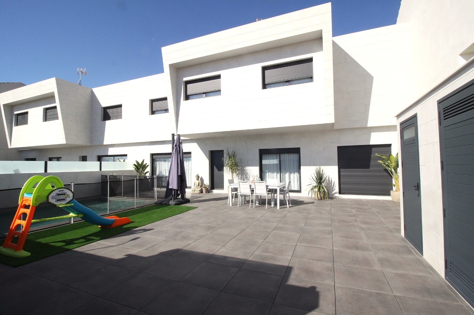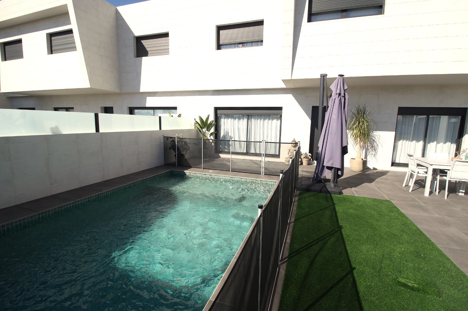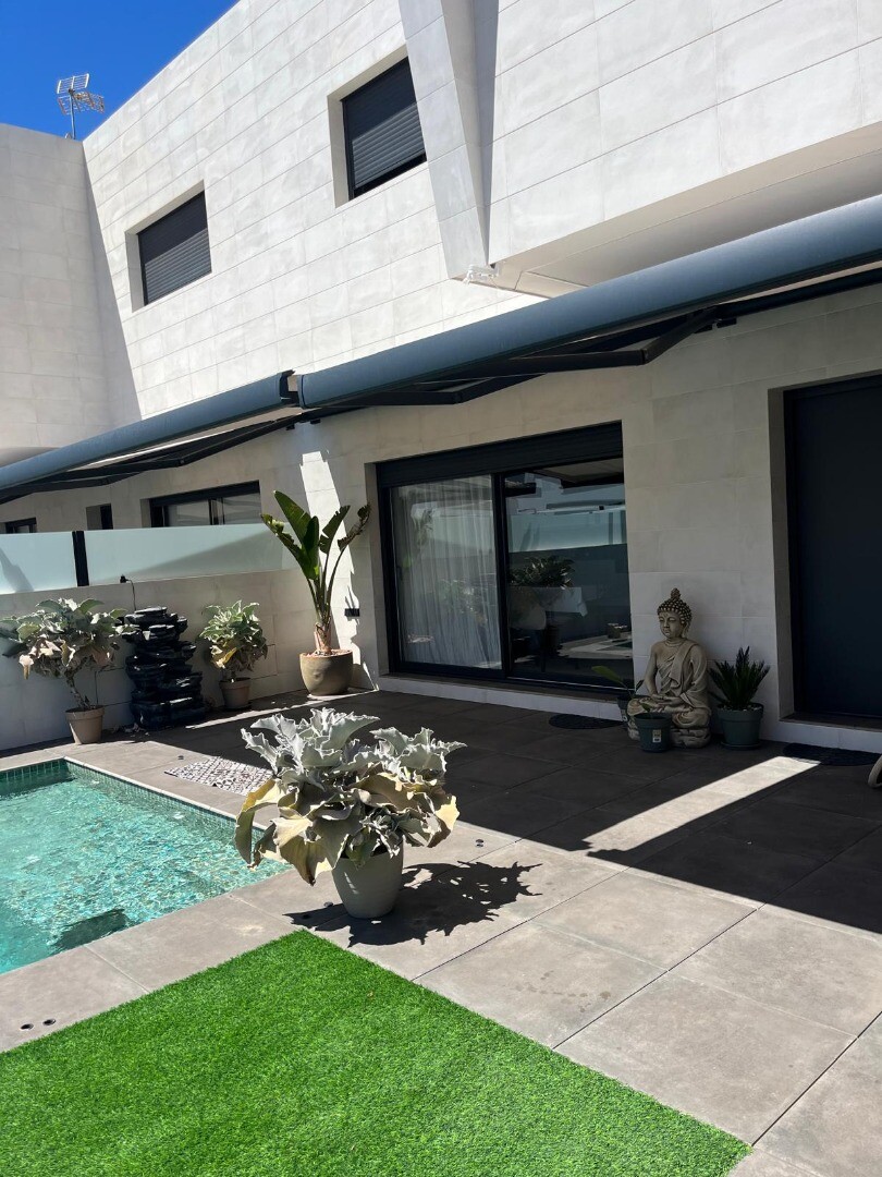 Недавно перепроданный двухквартирный таунхаус в Сан-Педро-дель-Пинатар с 4 спальнями, 2 ванными комнатами и туалетом на открытом воздухе у бассейна 6х4 м со встроенным джакузи. Дом расположен в 3 км от Средиземного моря и в 500 м от центра. Дом полностью меблирован, есть полы с подогревом, кондиционер и кухонная техника. До аэропортов Корвера и Али...канте можно добраться за 30 и 50 минут соответственно.
