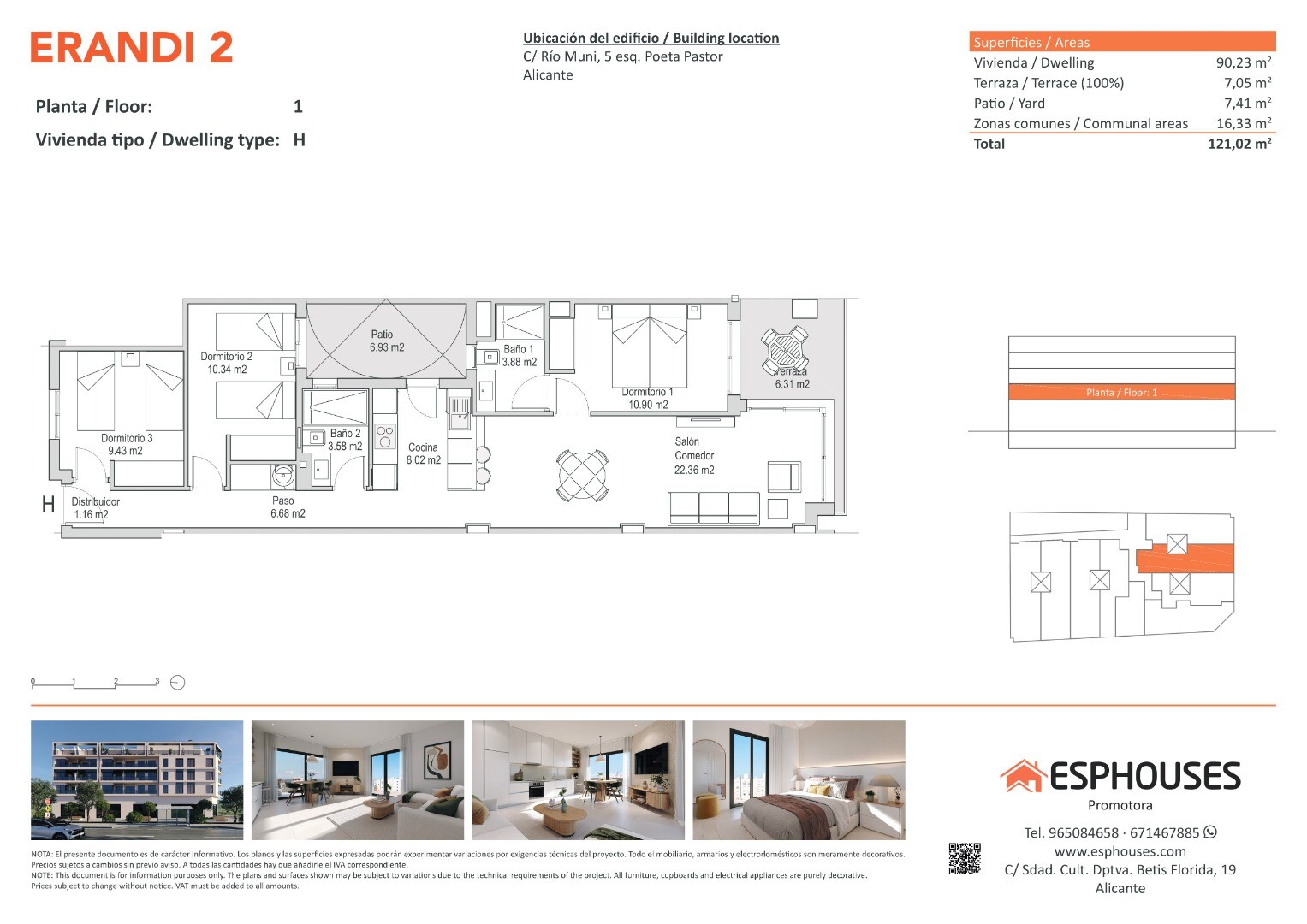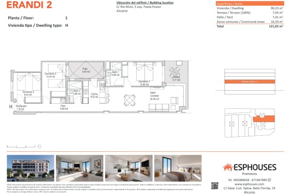 Эта новая квартира расположена на первом этаже здания ERANDI 2 и имеет общую площадь 90,23 м². В ней три спальни с встроенными шкафами, два санузла, гостиная-столовая с открытой кухней, терраса площадью 7,05 м² с южной ориентацией и частный внутренний дворик площадью 7,41 м² — идеальное пространство для отдыха на свежем воздухе круглый год.