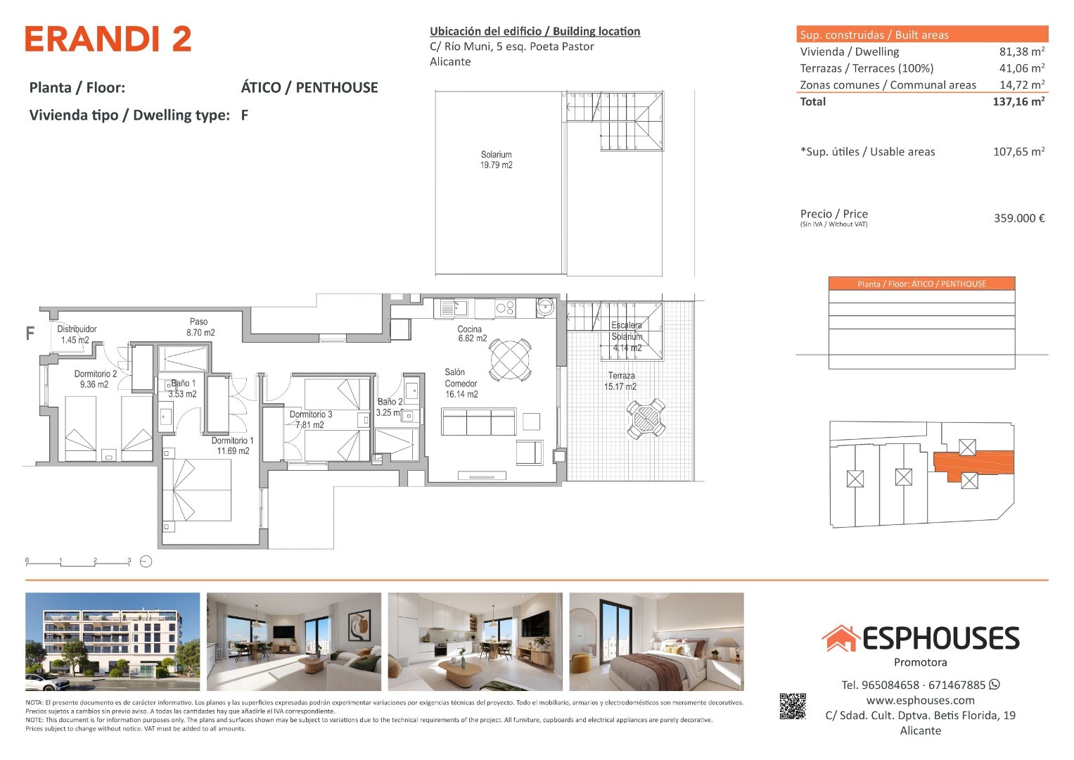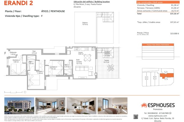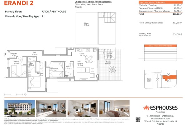 Этот новый пентхаус расположен на четвёртом этаже здания ERANDI 2 в знаковом районе Ла-Флорида — одном из самых развитых и хорошо связанных районов Аликанте. Общая площадь составляет 81,38 м², включает три спальни с встроенными шкафами, две ванные комнаты и просторную гостиную с открытой кухней в современном и функциональном стиле.