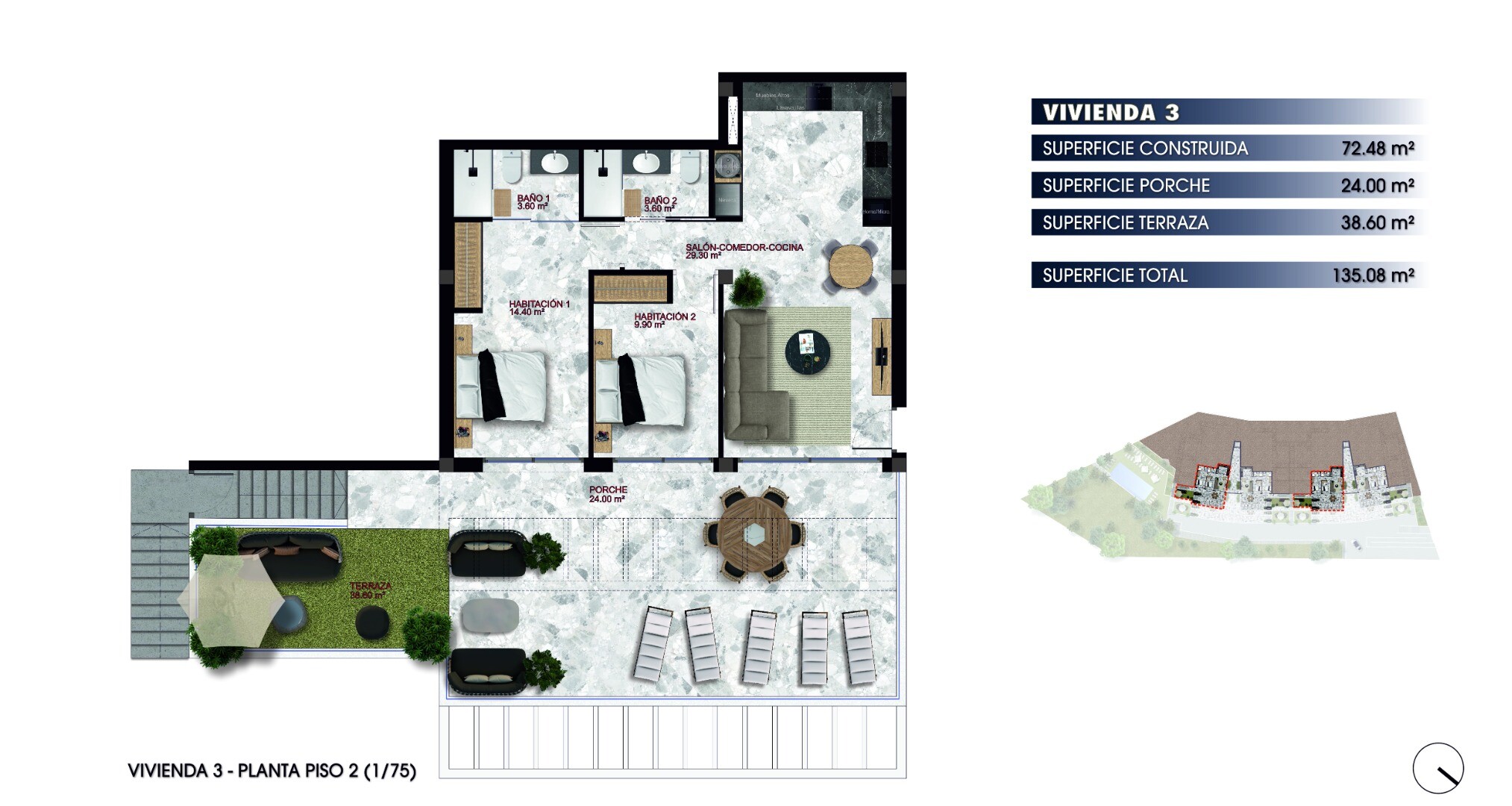 · 2 спальни + 2 ванные комнаты (1 ванная комната)