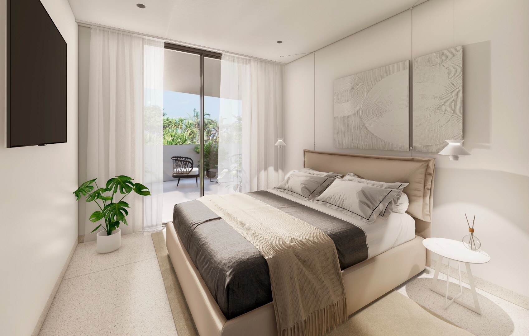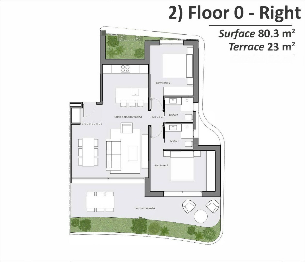 Квартиры с гостиной, кухней, 2 спальнями и 2 ванными комнатами и большими террасами в каждой квартире.