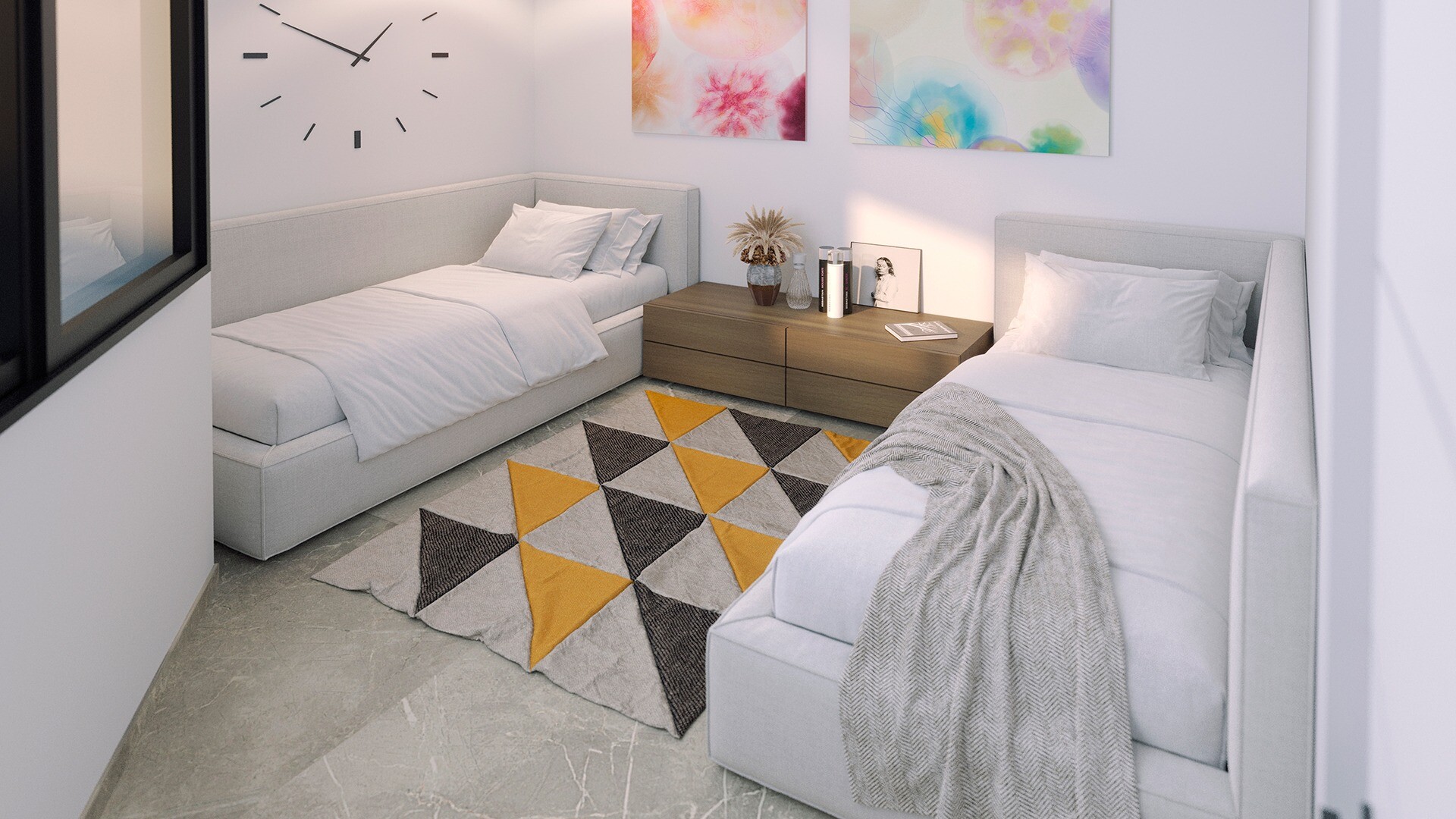 Здание выделяется своими удобными общими зонами: бассейн на первом этаже с детской зоной, тренажёрный зал и сауна, а также солнечная терраса на крыше с зонами отдыха, окружёнными пышной зеленью.