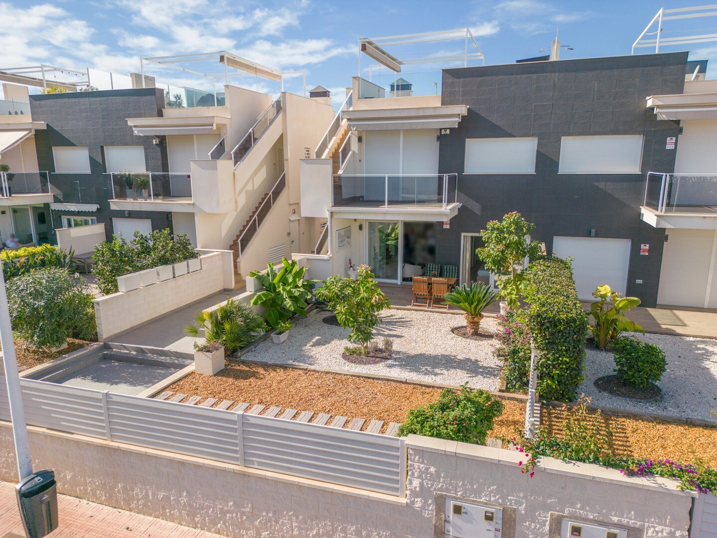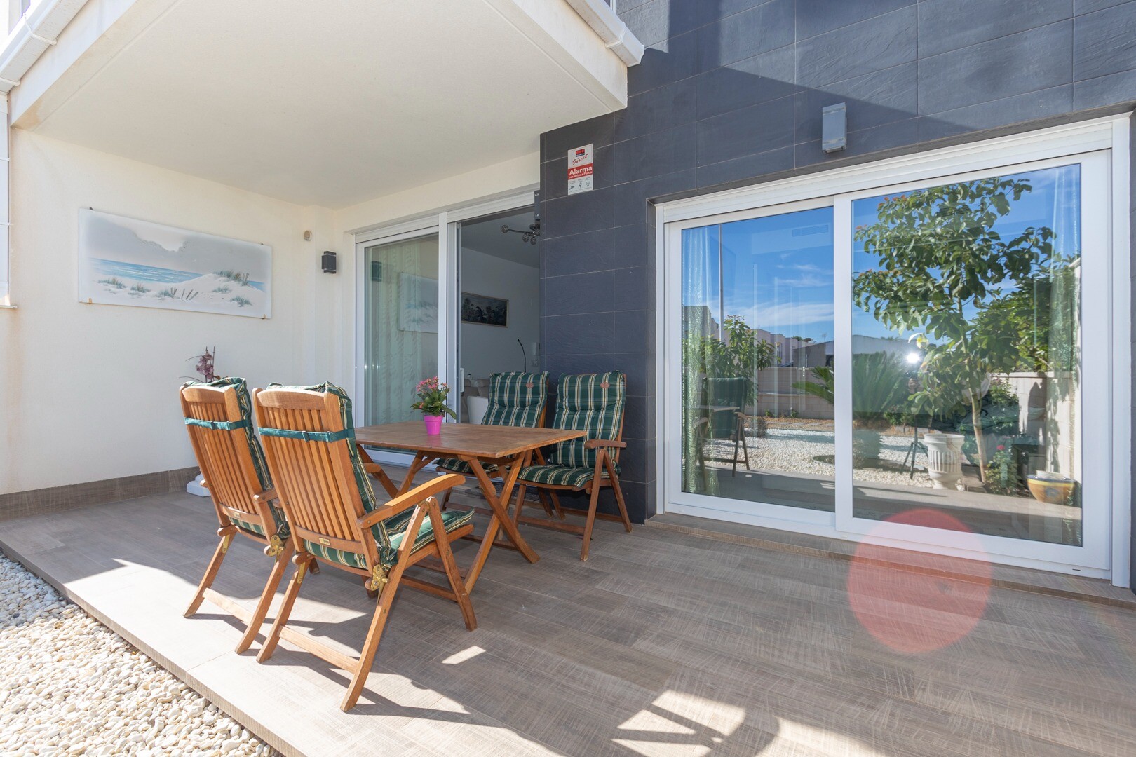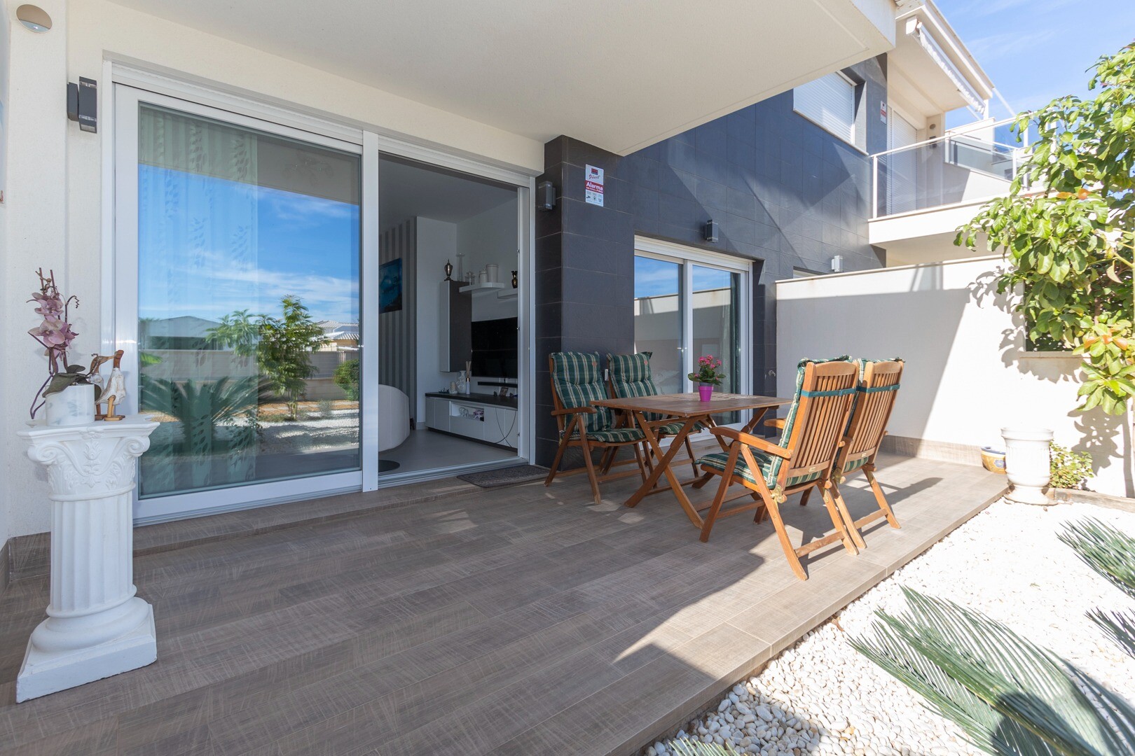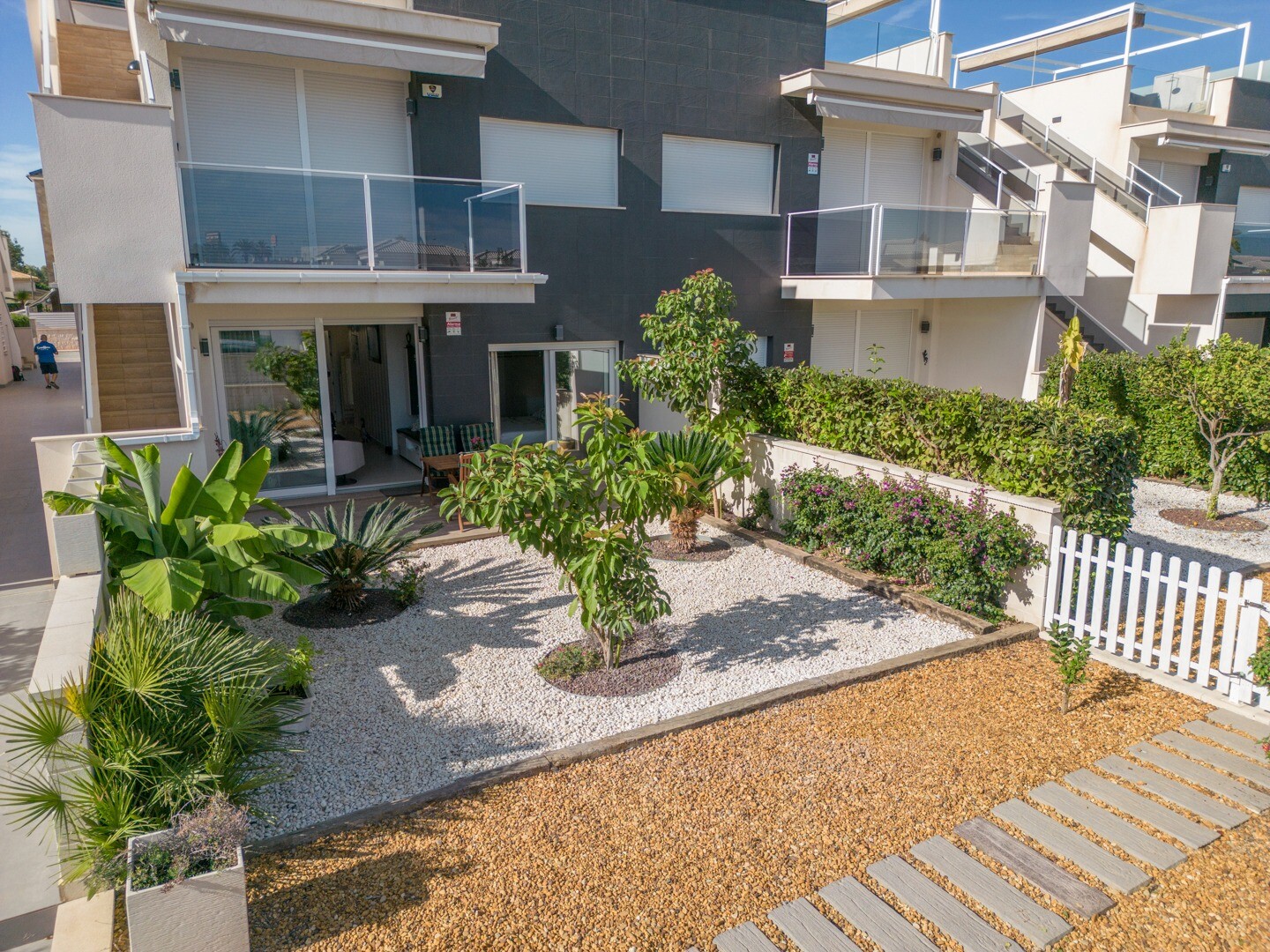В квартире встроенный кондиционер во всех комнатах и полы с подогревом. За квартирой также есть большой внутренний дворик площадью 10 м2, это пространство сзади, которое можно использовать как кладовую и которое обеспечивает естественное освещение. Фасад состоит из большой террасы и ухоженного сада с различными растениями и банановым деревом.