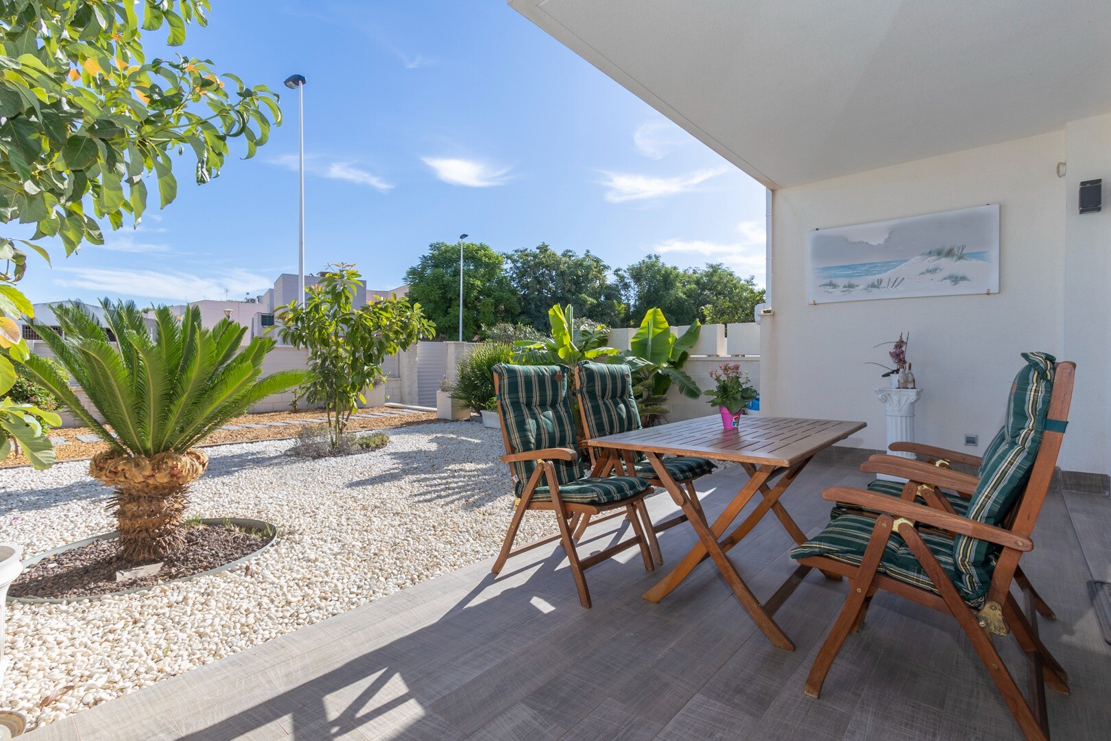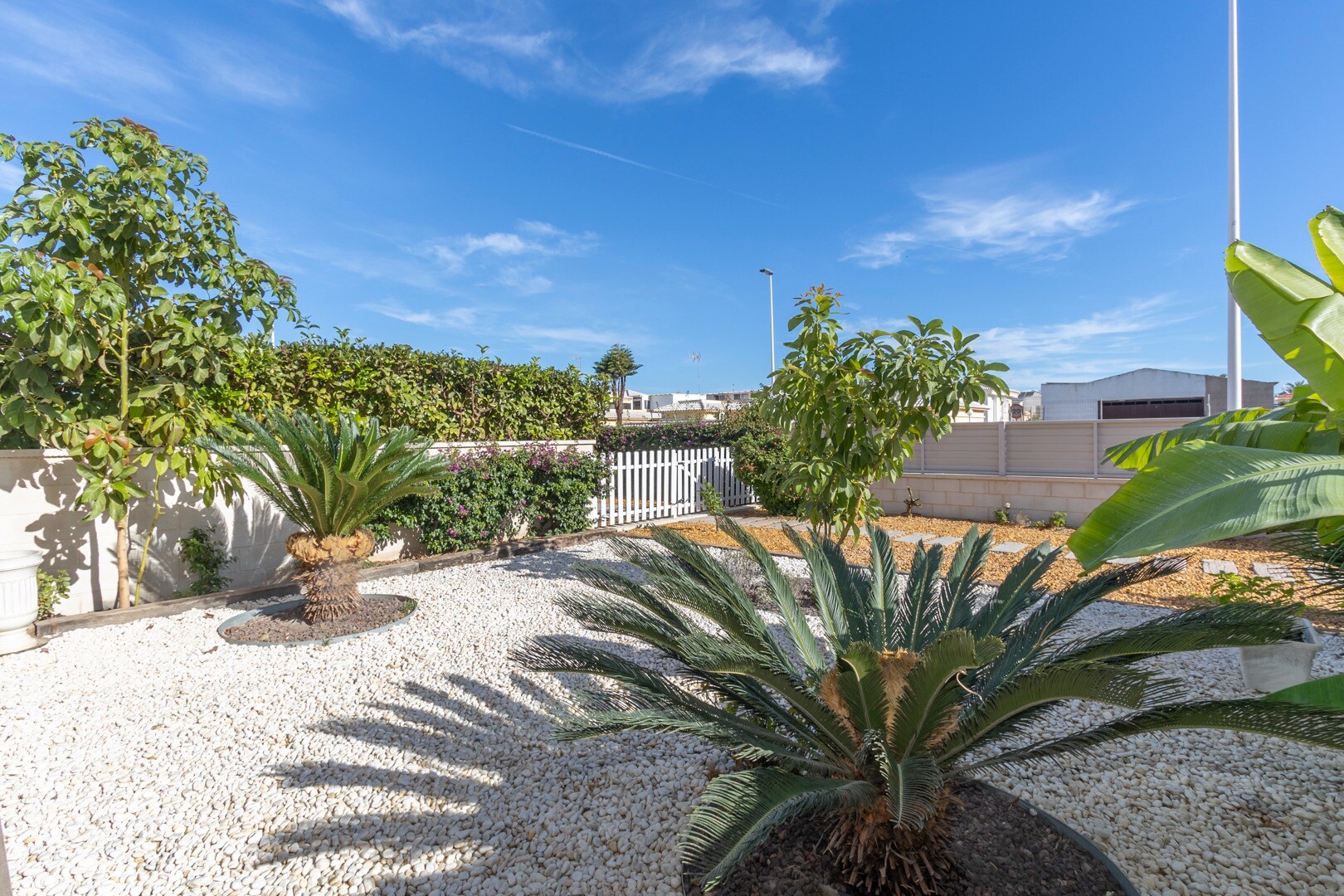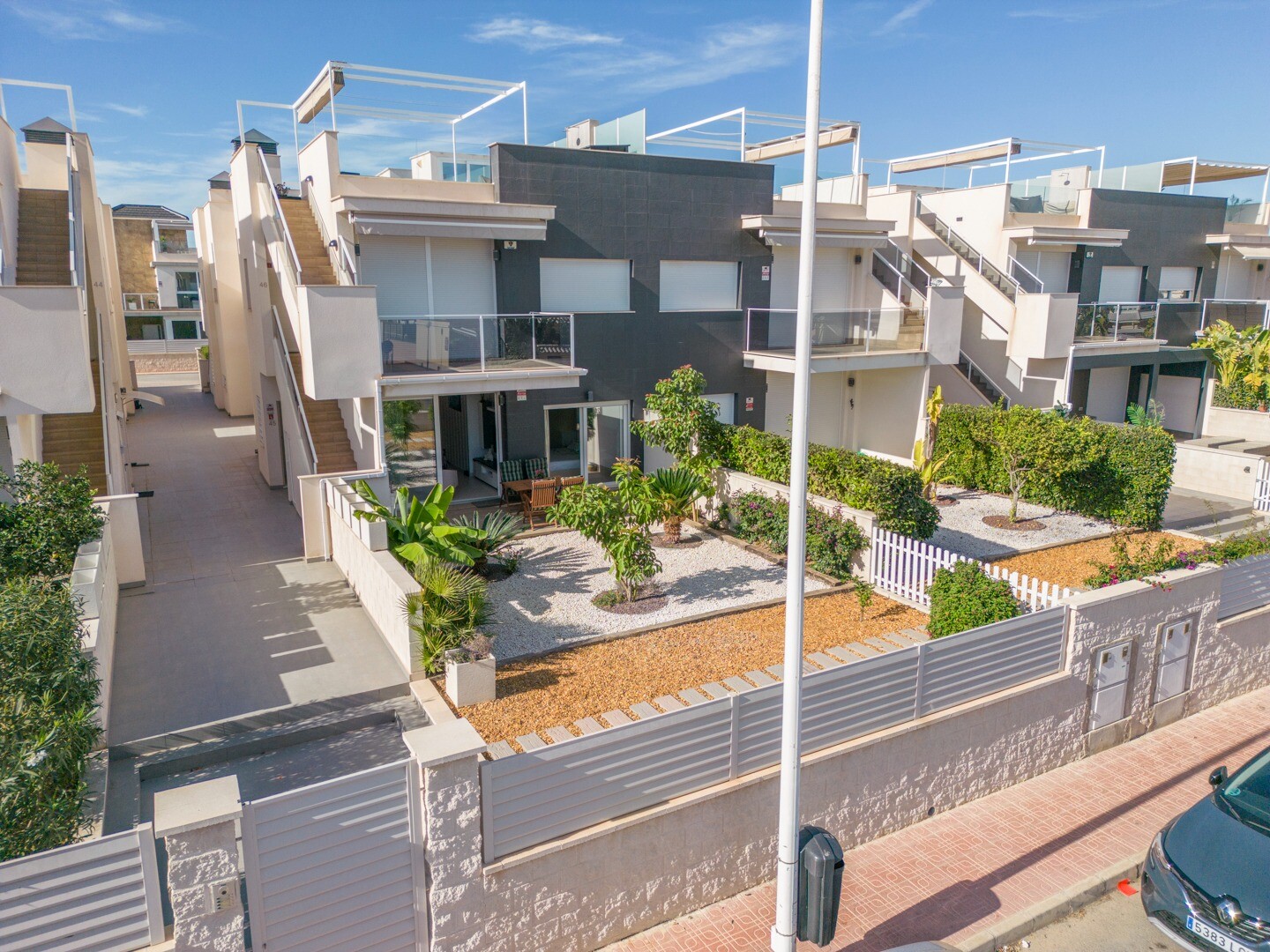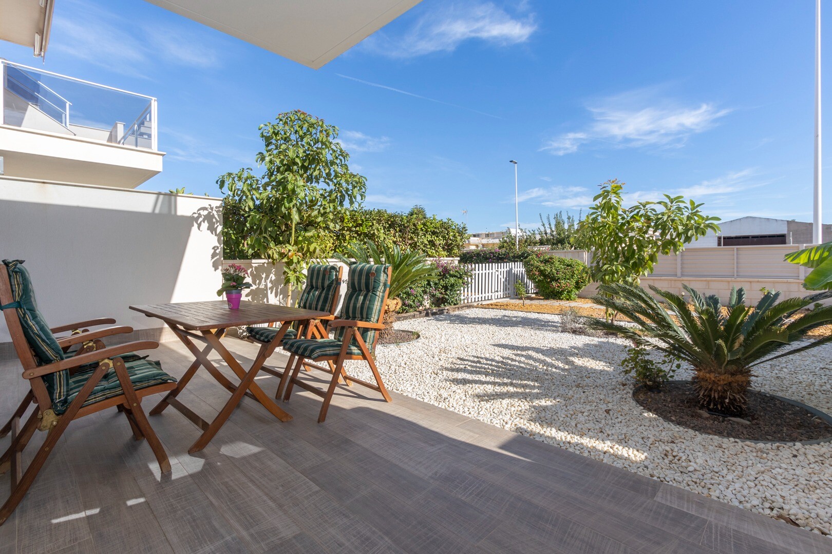 В квартире встроенный кондиционер во всех комнатах и полы с подогревом. За квартирой также есть большой внутренний дворик площадью 10 м2, это пространство сзади, которое можно использовать как кладовую и которое обеспечивает естественное освещение. Фасад состоит из большой террасы и ухоженного сада с различными растениями и банановым деревом.
