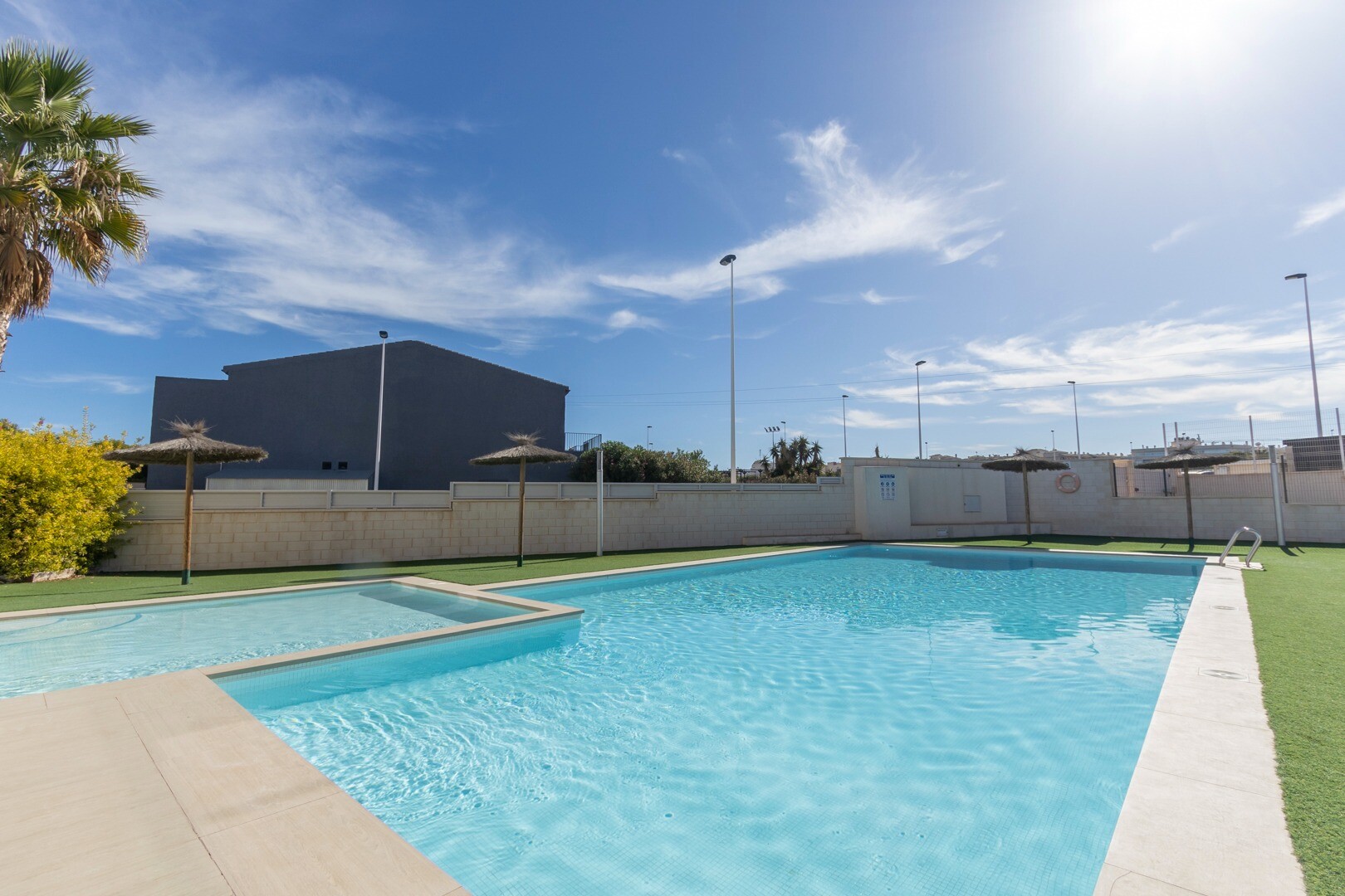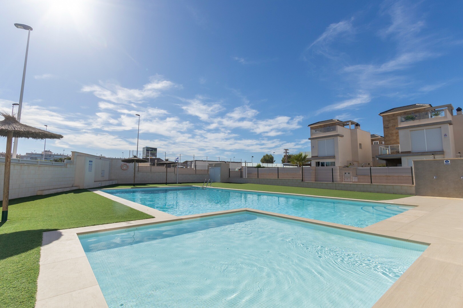 В квартире также есть гараж и подземная кладовая. Есть большой общий красивый бассейн с детской секцией, искусственной травой и зонтиками.