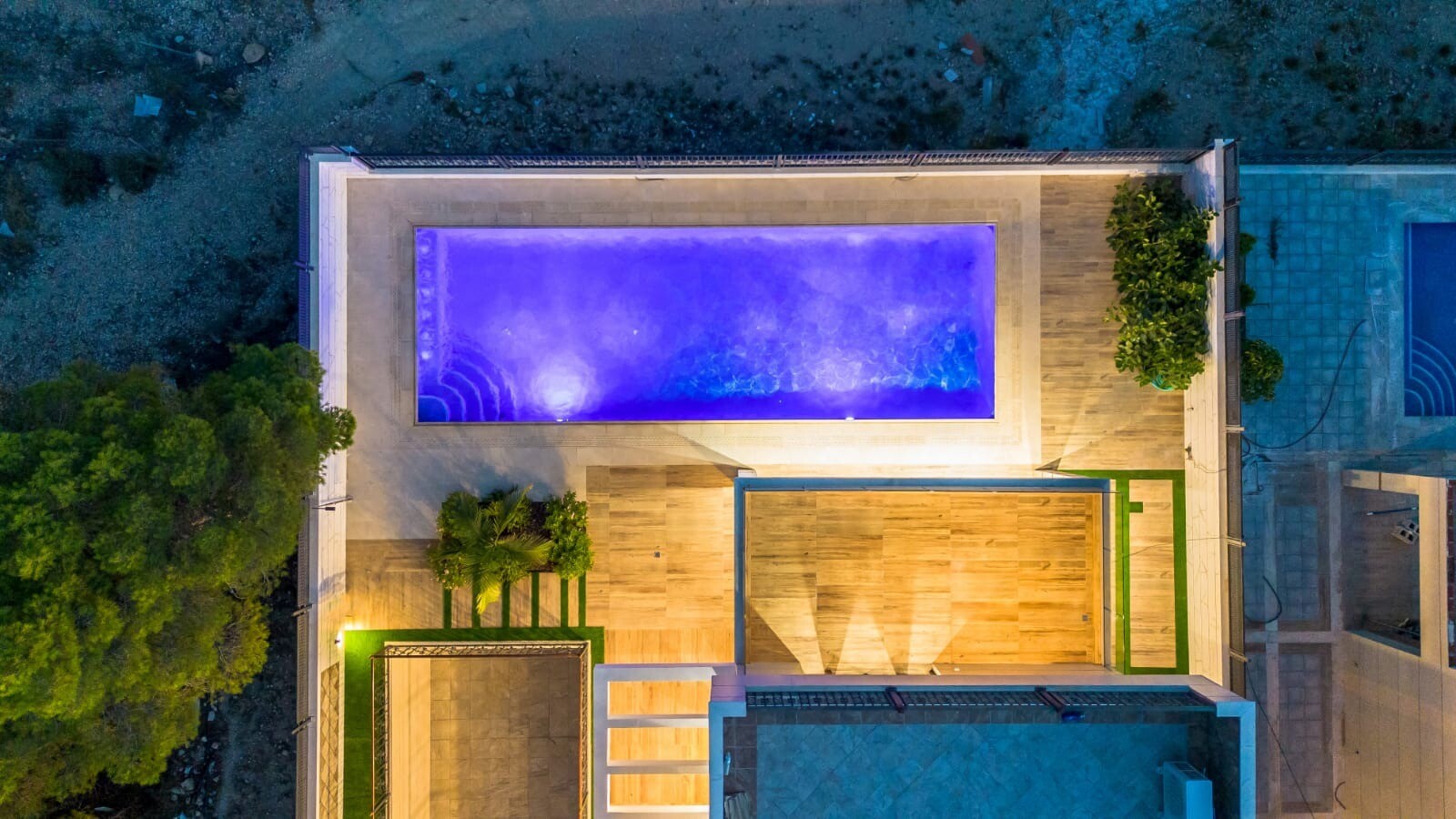 На участке есть красивый дизайнерский сад со сказочным частным пейзажным бассейном площадью 40 м2, искусственной травой, растениями и деревьями.
