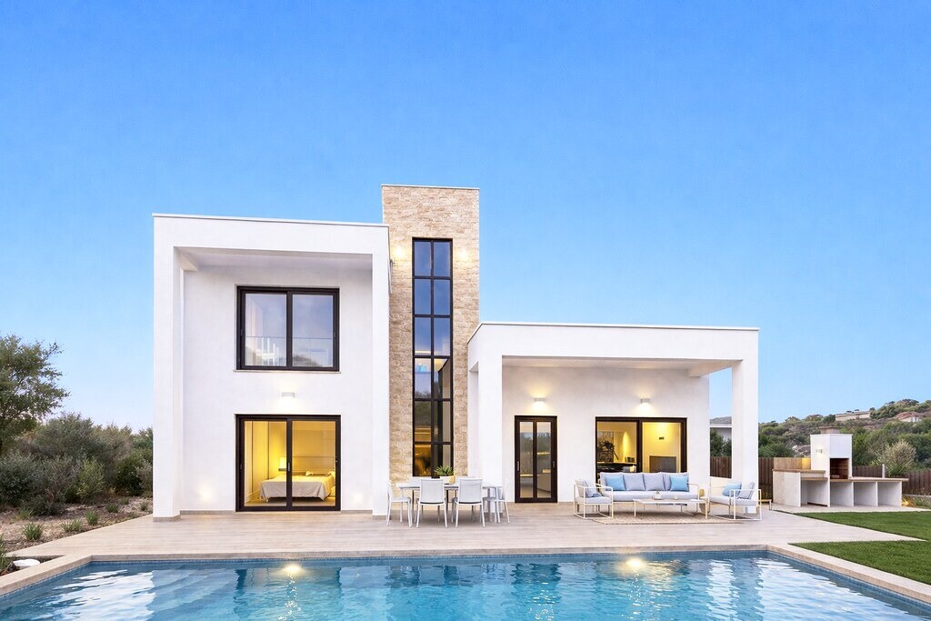 Вилла располагает 5 просторными сп...альнями и 4 ванными комнатами, а также светлой гостиной-столовой с большими окнами, обеспечивающими естественное освещение в течение всего дня и вид на море.