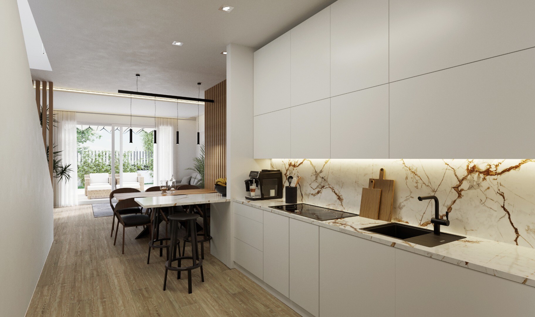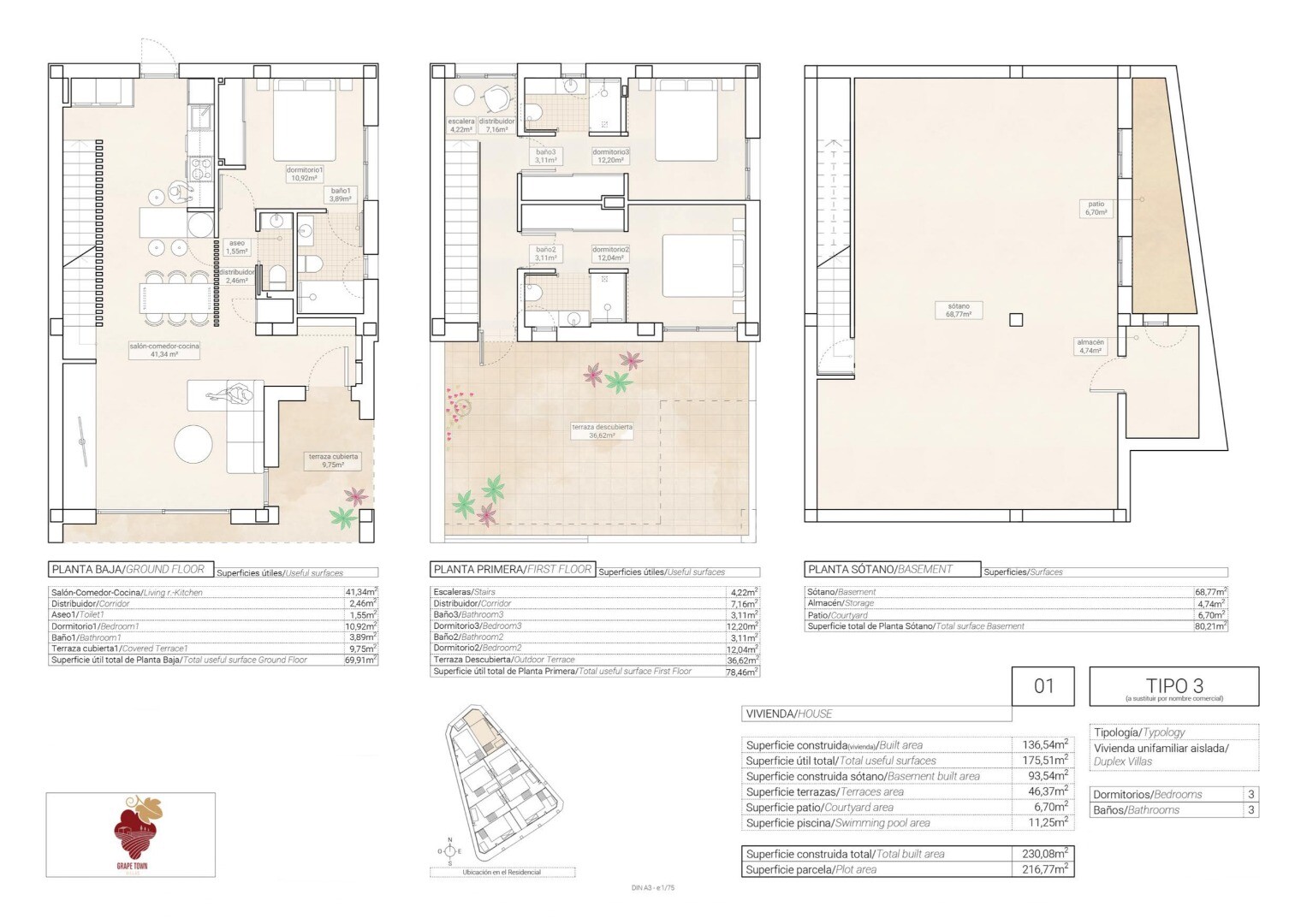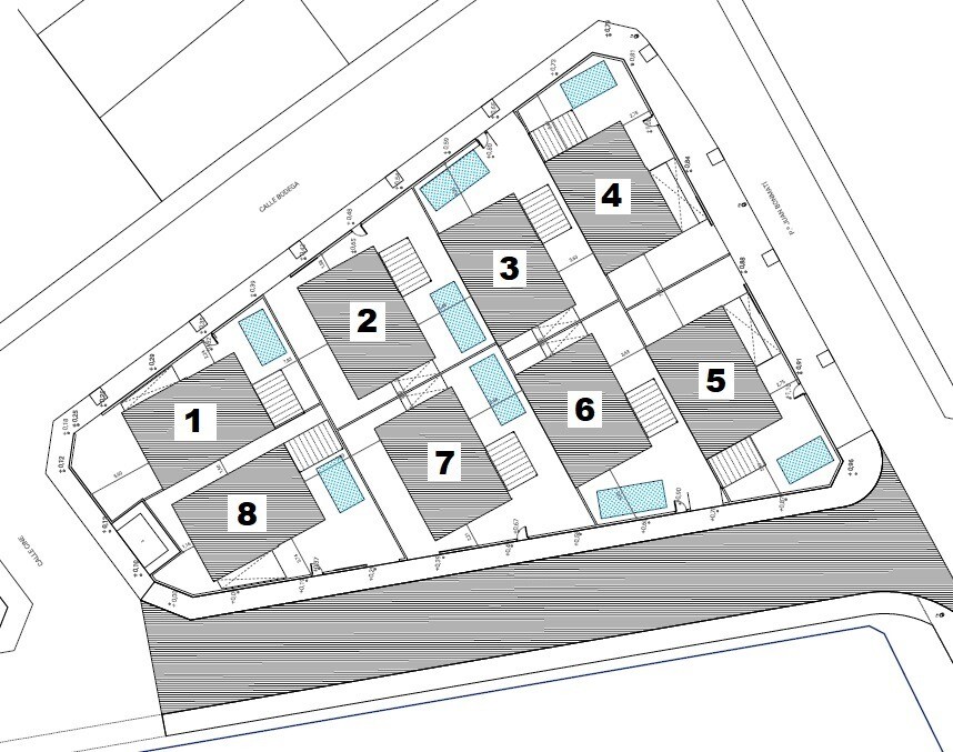 Небольшой участок из 8 отдельных вилл на частном участке, состоящий из двух этажей и подвала с английским патио. Открытая кухня, гостиная и столовая, гостевой туалет и спальня с ванной комнатой на первом этаже. Две спальни с ванной комнатой и большая терраса 36м2 на втором этаже. Частный сад с бассейном и площадкой для барбекю. Частное парковочное ...место на участке. Розетка для зарядки электромобилей. Индивидуальный закрытый доступ с улицы. Тепловая и акустическая изоляция в соответствии с новым Постановлением о техническом строительстве. Наружные столярные изделия и ставни из белого ПВХ. Внутренние столярные изделия и фасады шкафов выполнены из гладких белых лакированных панелей. Ванные комнаты и кухни выложены плиткой от пола до потолка высшего качества. Высококачественная сантехника и краны, унитаз со встроенным бачком. Полы в доме керамогранит или ламинат. Усиленная входная дверь. Полностью оборудованная кухня, верхние и нижние шкафы, столешница из гранита или синтетического агломерата (Silestone или аналогичного). Электромонтаж согласно R.E.B.T. (Низковольтный электротехнический регламент) с высокой электрификацией (9,2 КВт). Гладкая штукатурка на потолках, съемные потолки в санузлах с кондиционером. Канальная система кондиционирования воздуха (с тепловым насосом) на первом и втором этажах. Система принудительной вентиляции с рекуперацией тепла. Хорошая вентиляция домов обеспечивает хорошее качество воздуха в помещении. Принудительная вентиляция с рекуперацией тепла улучшает самочувствие и комфорт в доме. Система рекуперирует нагретый воздух в помещении, нагревает холодный воздух, поступающий снаружи зимой, и охлаждает теплый воздух.