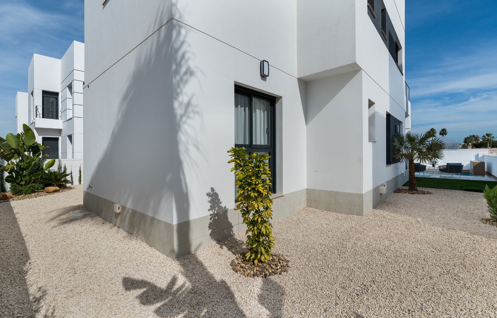 Эта вилла является одним из новых современных дизайнов этого застройщика с прямыми линиями, в которых белый кость смешан с эффектом камня на фасаде. В этом доме 3 спальни, одна с собственной ванной комнатой, расположена на первом этаже. Вилла состоит из 2 этажей и частного солярия 30м2, куда можно подняться по крытой лестнице.