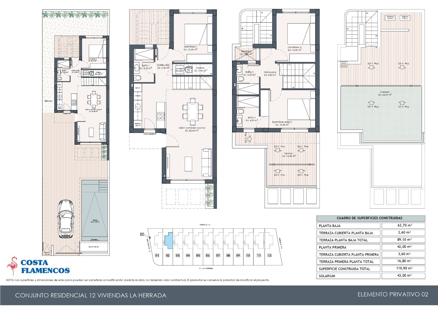В бассейне 7x3 м есть водопад с зоной отдыха с джакузи и душем на открытом воздухе. Виллы оборудованы солярием на крыше с видом на соленые озера Торревьехи, полностью оборудованными ванными комнатами с теплыми полами и внутренним освещением.