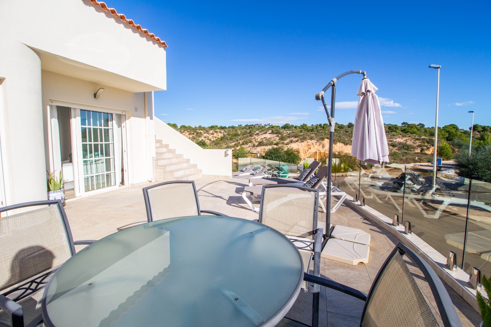 Отдельная угловая вилла с частным пейзажным бассейном и захватывающим видом на море и зеленые окрестности. Поле для гольфа Las Ramblas полностью отремонтировано.
