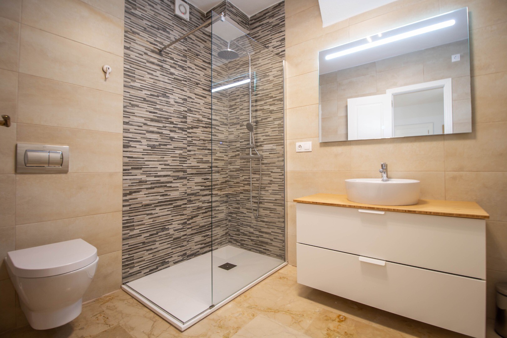 На верхнем этаже мы находим очень большую гостиную, столовую и кухню с выходом на большую террасу с барбекю и впечатляющим видом на море и зеленую зону. здесь также есть еще одна ванная комната.